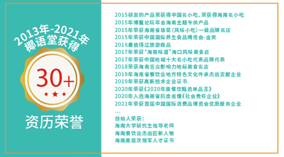 椰語(yǔ)堂公司介紹 椰語(yǔ)堂始創(chuàng)于2012年,是海南一家把海南清補(bǔ)涼為代表的特色小吃精致化、標(biāo)準(zhǔn)化并進(jìn)行連鎖發(fā)展的企業(yè),椰語(yǔ)堂專注于海南本土地域特色元素特別是椰子系列產(chǎn)品的深度研發(fā)。椰語(yǔ)堂被評(píng)為海南風(fēng)味小吃一級(jí)品牌名店,椰語(yǔ)堂多款小吃被評(píng)為海南名小吃、中國(guó)名小吃,并被選為中國(guó)地域十大名小吃代表品牌。椰語(yǔ)堂的全國(guó)門店分布在各高端商場(chǎng)、機(jī)場(chǎng)、郵輪、五星級(jí)酒店、動(dòng)車站、景區(qū)等。椰語(yǔ)堂清補(bǔ)涼被選為博鰲亞洲論壇專供產(chǎn)品、中國(guó)國(guó)際養(yǎng)生食品博覽會(huì)金獎(jiǎng)等殊榮,椰語(yǔ)堂清補(bǔ)涼在線下各連鎖賣場(chǎng)、盒馬鮮生、中石化易捷、中石油昆侖、全國(guó)30多家機(jī)場(chǎng)、五星、七星酒店等渠道銷售并成為政府及集團(tuán)采購(gòu)產(chǎn)品。在電商線上渠道,椰語(yǔ)堂椰奶清補(bǔ)涼無論在銷量和好評(píng)方面是品類第一,是深受消費(fèi)者喜愛的高品質(zhì)產(chǎn)品。椰語(yǔ)堂是海南大學(xué)食品學(xué)院研究生實(shí)習(xí)基地,公司發(fā)揮椰語(yǔ)堂研究院優(yōu)勢(shì),擁有產(chǎn)品研發(fā)方面的多項(xiàng)專利。椰語(yǔ)堂因?yàn)槠鋬?yōu)秀品質(zhì)及良好顧客體驗(yàn),被中央電視臺(tái)、湖南衛(wèi)視、旅游衛(wèi)視等多家衛(wèi)視、人民日?qǐng)?bào)、中國(guó)縣域經(jīng)濟(jì)報(bào)、新浪、騰訊、SSBD等國(guó)內(nèi)外媒體報(bào)道宣揚(yáng)。椰語(yǔ)堂是海南文化的傳播和弘揚(yáng)者,是海南地標(biāo)美食品牌的優(yōu)秀代表和海南地域文化的一張亮麗名片,同時(shí),椰語(yǔ)堂也是中國(guó)連鎖經(jīng)營(yíng)協(xié)會(huì)會(huì)員單位。 more |